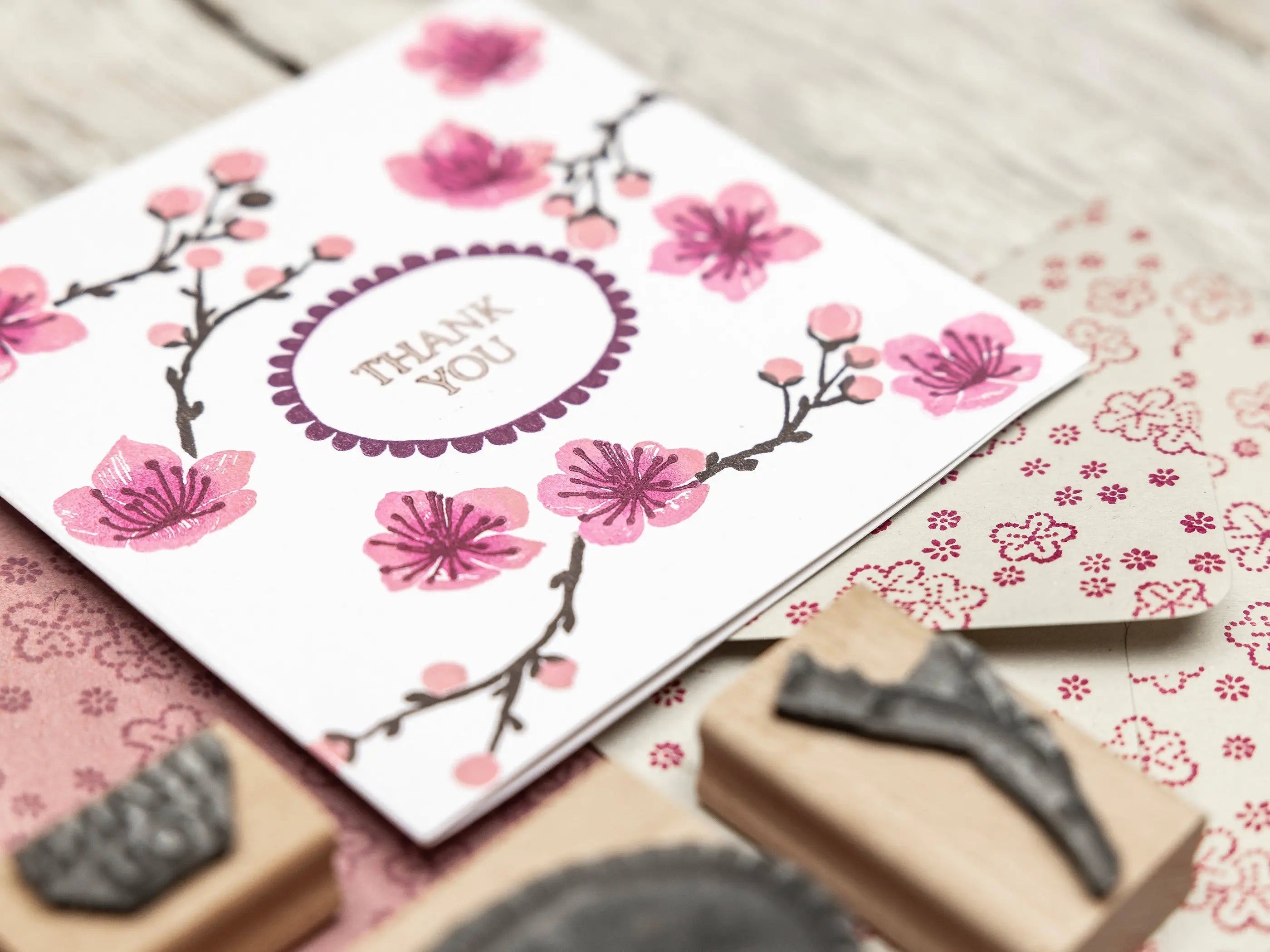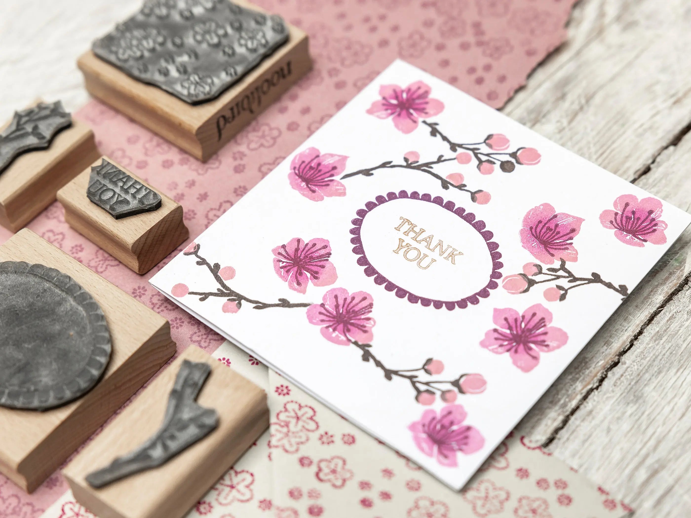 Try layering different shades of pink to create depth and movement in your blossoms, and stamp onto handmade paper or kraft card for a beautifully textured, organic look. For an extra special touch, add a gold-inked detail or a hand-tied twine bow to finish your card or gift wrap.